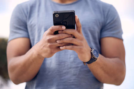 Young man outdoors, holding smartphone, mid section