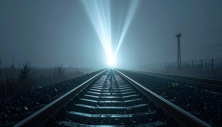 Powerful beams of light cut through the dense night fog, illuminating a straight path along empty railway tracks.