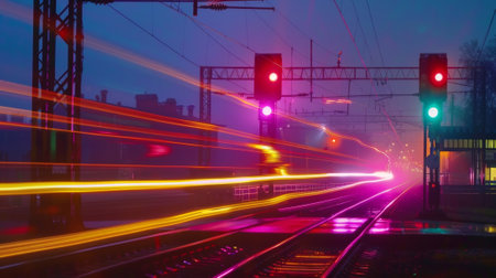 A vibrant night cityscape showing blurred train lights and glowing city buildings at dusk