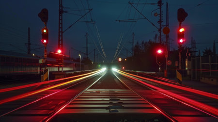 The vibrant headlights of a speeding train create a mesmerizing light trail in front of the railway crossing