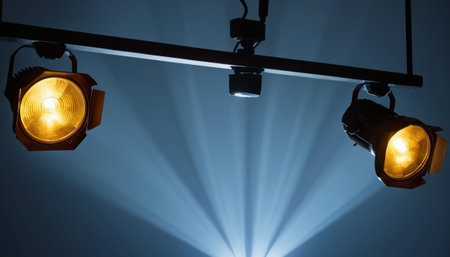 Spotlights illuminate the stage. Spotlights illuminate the stage. Spotlights illuminate the stage.