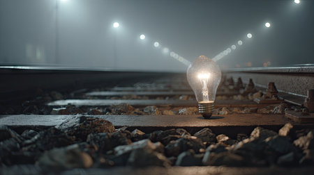 A captivating image featuring a glowing light bulb placed on train tracks, surrounded by rocks and enveloped in thick fog at night. The blurred lights illuminate the scene, creating a mysterious, atmospheric effect that evokes feelings of solitude and tranquility.