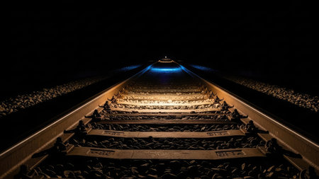 This image showcases a railway track receding into the darkness. The scene is illuminated by an unseen light source, casting a warm glow on the tracks and surrounding area. The composition features a symmetrical perspective and emphasizes lines. This visual could be used for various commercial or editorial purposes, focusing on themes like travel and transportation.