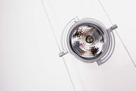 Close-up of electric white lamp. Indoor or outdoor decorative element. Energy saving light bulb, led lamp, spotlight. Repair and maintenance of electrical equipment concept
