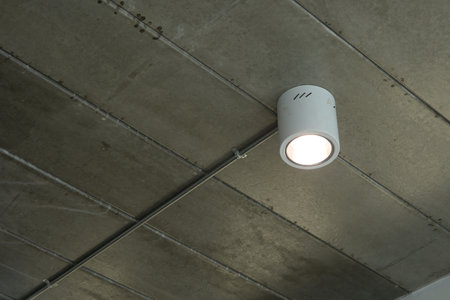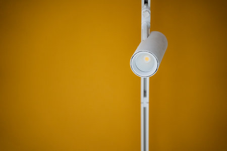Directional LED lights on rails under the ceiling in a modern warehouse, shopping center building, office or other commercial real estate object.