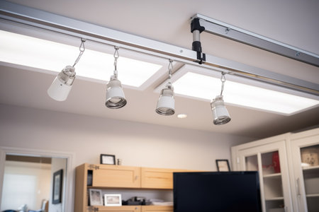 Close-up of a sleek track lighting system with four spotlights on a white ceiling.