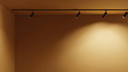 This minimalist interior showcases a warm-toned wall with modern track lighting, creating a serene and stylish atmosphere perfect for various settings.