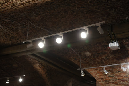 Shine Electrical Led Spot Light on White Ceiling Copy Space. Modern Stage, Museum, Exhibition Hall, Office or Apartment Illumination Equipment. Design Interior. Decorative Electric Spotlight Lamp