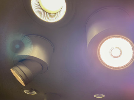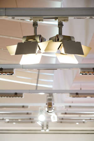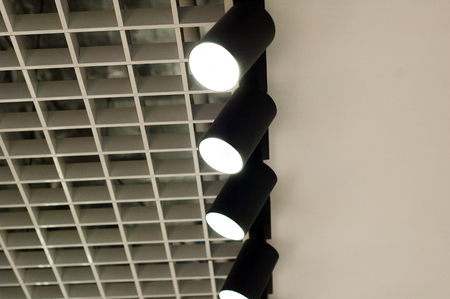 Bright luminous spotlights on the ceiling to illuminate the room.