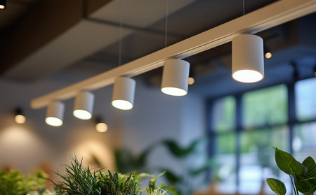 Stylish pendant lights hang over a wooden shelf adorned with lush green plants, creating a fresh and inviting ambiance in a contemporary indoor space.