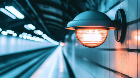 A close-up of the smooth, industrial surface of a subway tunnel wall, with modern lighting fixtures and reflections from the track below, creating a sleek, urban look