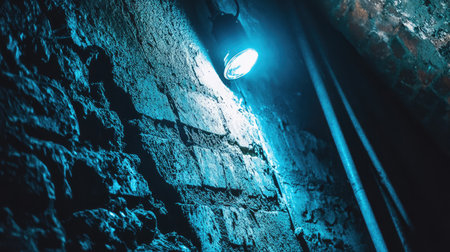 A tactical torch illuminating old metal pipes and wires in a dark industrial basement