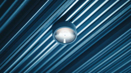 This image showcases a modern ceiling light fixture that emits a warm glow, set against a backdrop of sleek blue lines. Perfect for interior design inspiration.