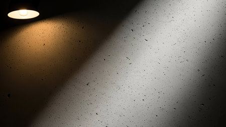 A close-up view displays a textured concrete wall illuminated by a focused spotlight. The scene features strong contrasts between light and shadow, with a warm-toned area contrasting with a cooler, highlighted section. This image showcases a rough surface, emphasizing the play of light and shadow, and offers diverse applications for design or advertising.