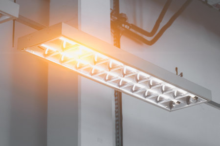 Close-up of an industrial fluorescent lamp, lamps hanging from the ceiling in a warehouse