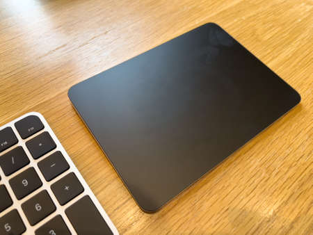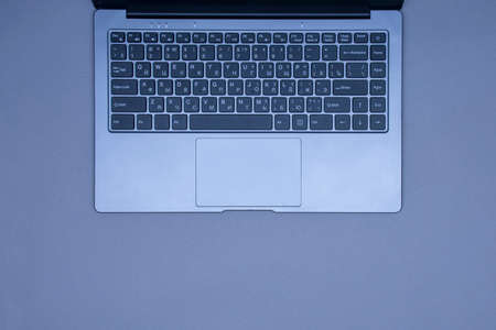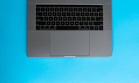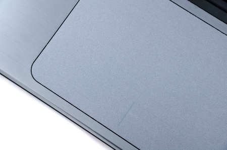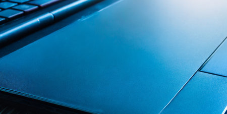 Close-up macro photo of built in mousepad of metallic pc laptop portable computer in blue tone. Artistic color digital photo with shallow depth of focus.