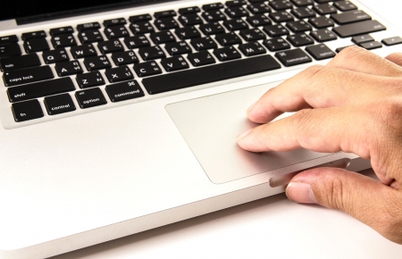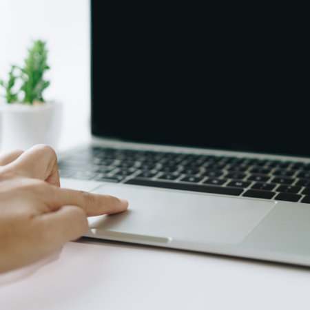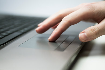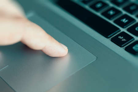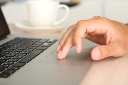 Hand on laptop touchpad, tapping and scrolling with fingers closeup.