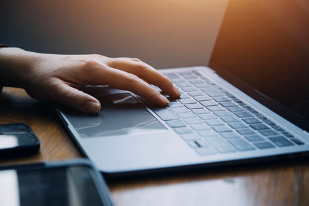 Closeup image of hands using and typing on laptop keyboard on the table on wooden table