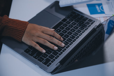 Top view, Female hands typing on notebook laptop keyboard in her comfortable and minimal office desk