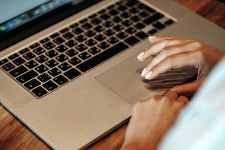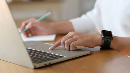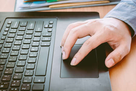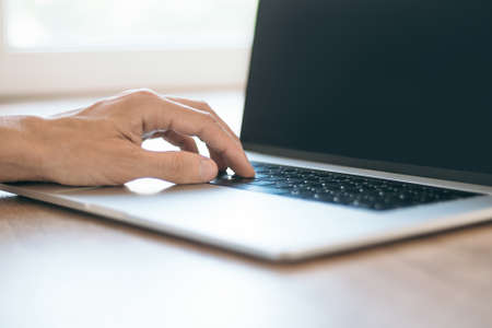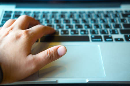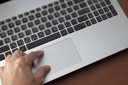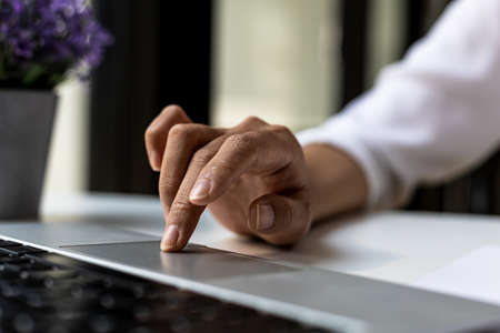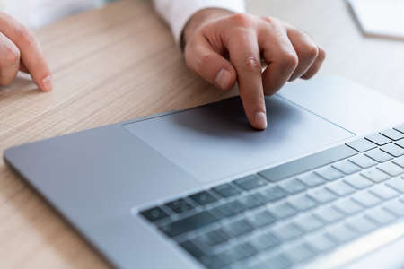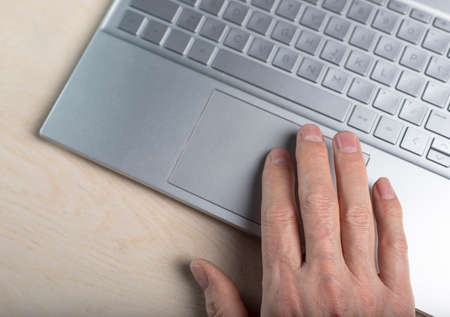 Close up Man hands use touch pad on laptop working at home. Hands touch touch pad use internet for cloud data social network media searching. Work from home new normal concept.