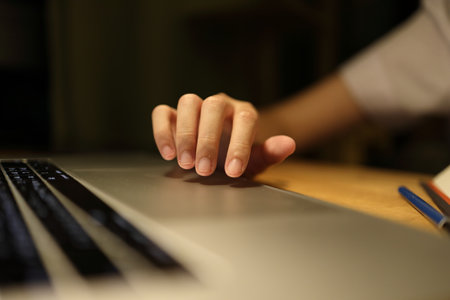 Virtual searching. Internet technology. Laptop working. Digital lifestyle. Unrecognizable woman scrolling portable computer touch pad light lamp dark shadow.