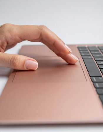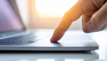 A close-up shot captures a finger delicately navigating the trackpad of a sleek, modern laptop.