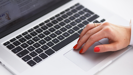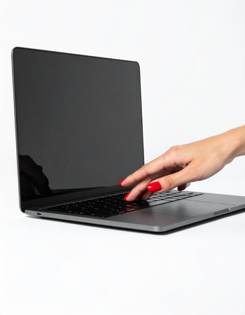 A professional woman with a stylish red manicure gets to work on her sleek, modern laptop. The clean, white background emphasizes focus and productivity in a contemporary business environment.