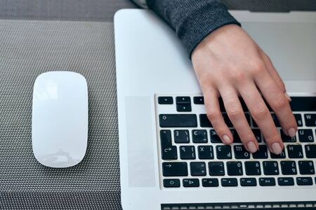 Communication, workplace, business, education, freelance, internet, leisure time and technology concept. Close up side view - woman hands with manicure typing on laptop computer keyboard