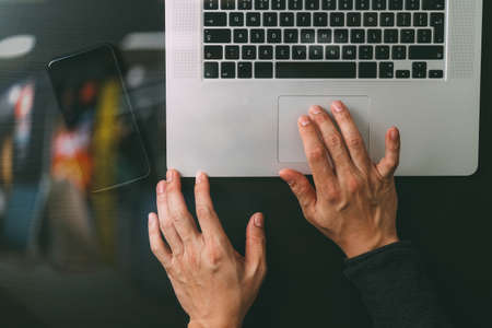 top view of businessman typing keyboard with laptop computer on wooden desk in modern office,black and white
