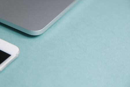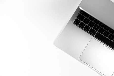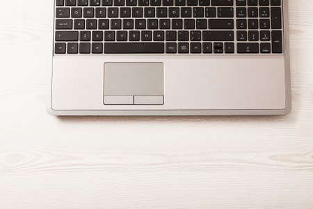 White technological background. top view copy space.Laptop computer on a wooden desk.