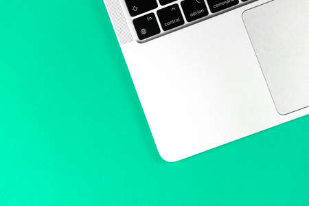 Modern laptop flat lay silver background. notebook keyboard. Office workplace table, minimal design concept. top view, copy space