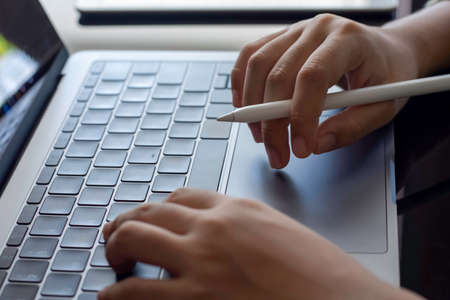 Close up, business hand with stylus pen working on digital tablet and laptop.