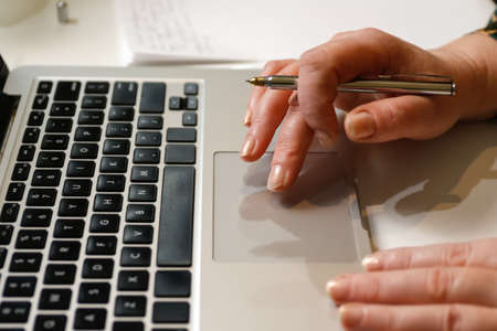 Defocus female hand holding pen. Unrecognizable elegant woman working on computer at office. Start or finish of a work day. Workspace. Paperwork. Time for work. Closeup businesswoman. Out of focus.