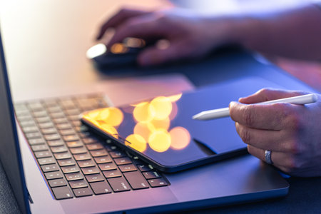 Closeup view of a designer or illustrator using a digital stylus pen working on a tablet. Wide view image.