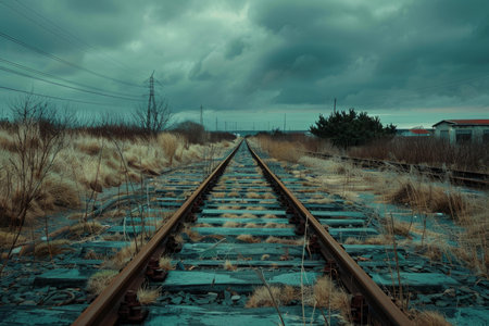 Abandoned railway amidst dry grass under a gloomy sky, invoking a sense of solitude