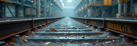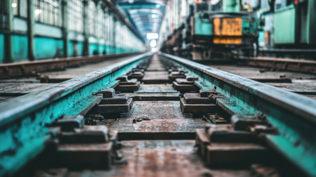 Close-up perspective of industrial railway tracks inside a spacious warehouse, emphasizing rust and metal details. An intriguing view showcasing urban infrastructure.