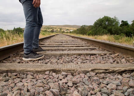 Unrecognizable young man standing on the railway tracks in a rural scene in a cloudy day. Tandil, Buenos Aires, Argentina.