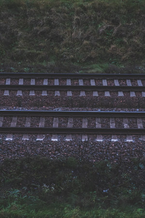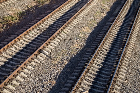 Rails at the electrified railway corridor. Concept railway, transportation, travel.
