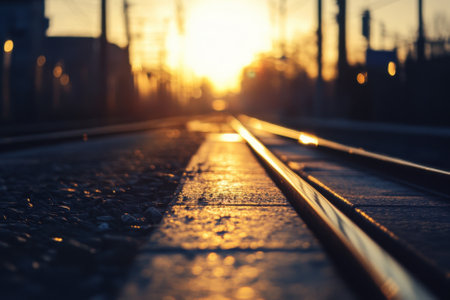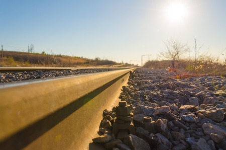 Railroad tracks stretch towards a bright sunset, with focus on the gravel stones. The composition features a low-angle perspective, emphasizing the tracks' linear design against a blurred background. The overall style suggests a sense of depth and evokes feelings of travel and journey. The image can be used for various commercial or editorial applications.