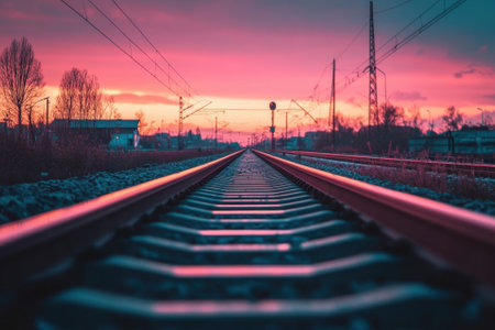 A breathtaking sunset view along railway tracks captures the beauty of nature with vibrant colors in the sky and serene surroundings, inviting exploration and adventure.