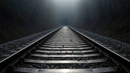 The image features parallel railway tracks stretching into a distant, hazy vanishing point. The monochromatic tones emphasize the gravel and steel, with diffused lighting from an undefined source. The composition focuses on perspective, suggesting travel, transportation, and concepts of time. This image has potential uses in editorial projects or commercial designs.