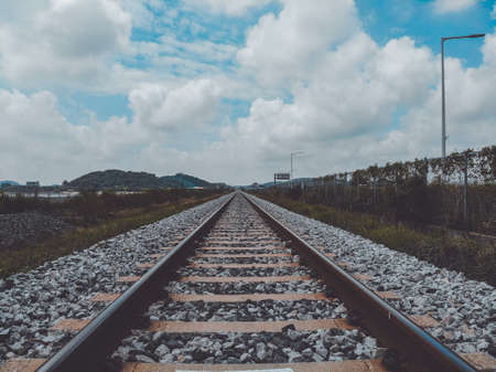 Railway tracks at sunset in the countryside of Thailand, Asia.