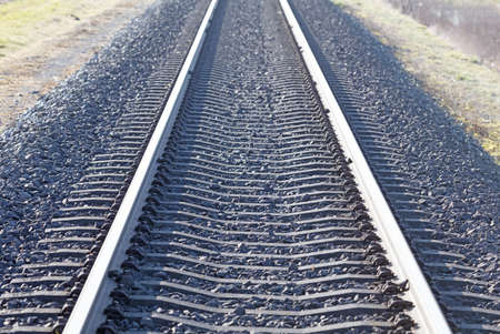 Close up rail joint, rail anchor with perspective line from railroad tracks