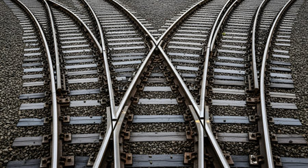 A top-down, symmetrical view of intersecting railway tracks on a gravel bed, showing switches and diverging paths. The image symbolizes choices, decisions, crossroads, complexity, journey, and different directions or possibilities.