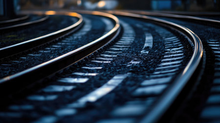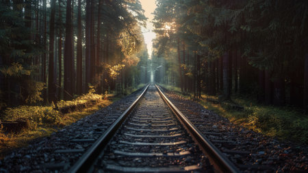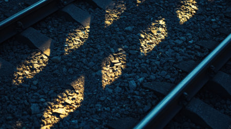 Captivating interplay of light and shadow on railway tracks creates a tranquil scene with gravel texture highlighting the beauty of dusk. Perfect for explorative themes.