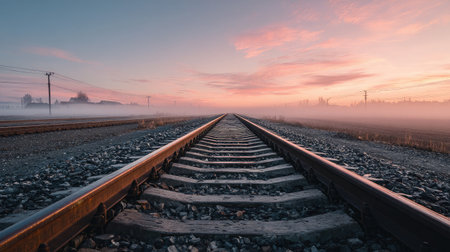A stunning view of railroad tracks stretching into the foggy distance during sunrise, showcasing vibrant colors and a calm atmosphere, perfect for evocative imagery.