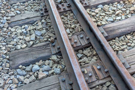 The close-up of Iron rails for the railway on gravel stones,Vintage tone