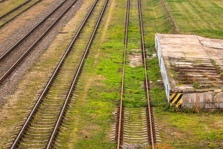 Railway tracks in the countryside. Perspective view of the railway.