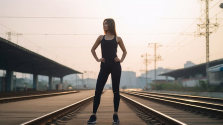 Working hard Beautiful young woman in sports clothing exercising using resistance band while standing on the running track outdoors : Generative AI