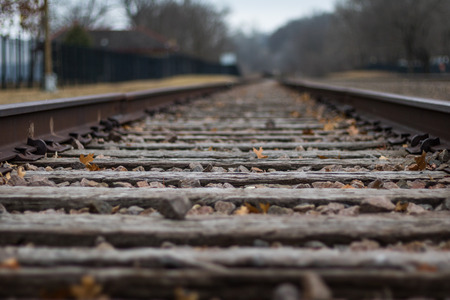 close up low angel of railroad tracks, very shallow depth of field leaving the track to fade off into the blur of the background